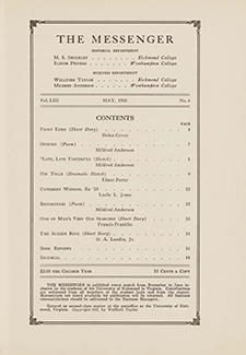 Richmond College’s first student publication, Monthly Musings, was the precursor to The Messenger. Jointly sponsored by the two campus literary societies, the Philologian and Mu Sigma Rho, it served as a “mirror of college life and the exponent of college thought.” In 1878 the name was changed to The Messenger and continued as a literary magazine and miscellany. Archival issues of both Monthly Musings and The Messenger are presented here.
