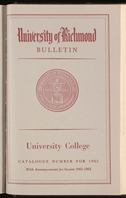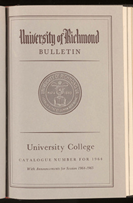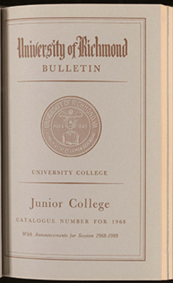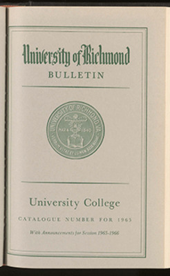The Junior College of University College, organized in 1964, [was] a coeducational day school that provided two years of liberal arts education for high school graduates. Through a cooperative Evening Program, students, after completing two years in the Junior College, [could] complete all requirements for an undergraduate degree in Commerce, or they [could] continue their educational programs in other divisions of the University of Richmond. Graduate degrees in Commerce or the Humanities [could] be earned in the evening in University College.